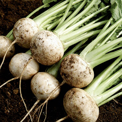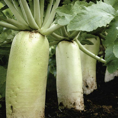 日本人に最もなじみ深い野菜で、練馬、三浦、桜島、聖護院、守口など、その品種の多様さには驚くべきものがある。生育適温は17〜20℃と冷涼な気候を好むが、10℃以下の低温では花芽分化を起こし、根の肥大が妨げられるので、種まきの適期(秋作では8月下旬~9月上旬) を守ることが重要である。種まきは直まきのみで、岐根を防ぐためにも「深耕と精耕」がキーワードとなる。栄養的には、ビタミンCや消化酵素のジアスターゼを含む健康野菜で、特に葉には、カロテン、ピタミンB、C、D、Eが多量に含まれ、タンバク質も多く、最近ではダイコンの葉を収穫対象とする品種も登場している。