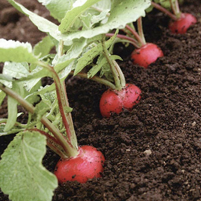 別名「ハツカダイコン(二十日大根)」。30日前後の短期間で収穫できる小型のダイコンである。比較的冷涼な気候を好むので、春(3月中旬~5月) と秋(9月~10月)が種まきの適期である。直根類なので、直まきし、根を肥大させるためには適正な株間をとることが大切で、3〜4cm間隔に間引くとよい。夏季は、害虫が多発するので、寒冷紗等でトンネル状に覆って栽培するとよい。畑から抜いたラディッシュの鮮やかな赤色は収穫の喜びを倍増させる。また、生育期間が短いので、空いた畑に次作までの間作としてー作栽培すると畑の有効利用になる。収穫が遅れると、すが入り、品質が低下するので注意する。